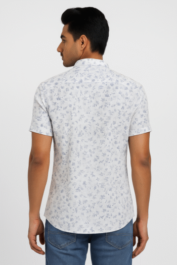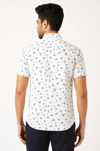 ₹599.00Original price was: ₹599.00.₹499.00Current price is: ₹499.00.Select optionsA stylish white short sleeve shirt with subtle navy floral prints, perfect for smart-casual days and evening outings.