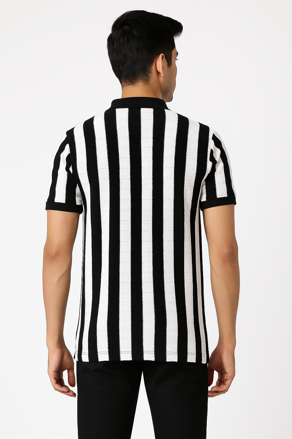 Men’s Black & White Vertical Striped Polo T-Shirt