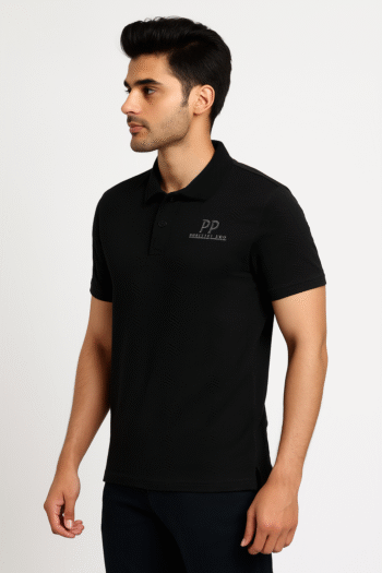 ₹599.00Original price was: ₹599.00.₹499.00Current price is: ₹499.00.Select optionsA sleek black polo t-shirt featuring a minimal chevron texture and tonal “PP Advantage” chest logo — perfect for smart casual and active wear.