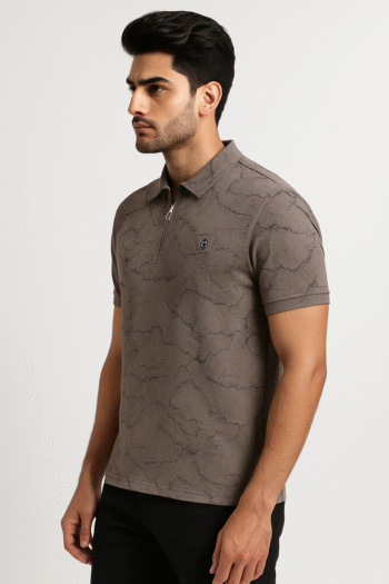 ₹599.00Original price was: ₹599.00.₹499.00Current price is: ₹499.00.Select optionsA stylish brown polo t-shirt featuring an abstract marble print and modern zip-up placket — perfect for a refined yet casual look.