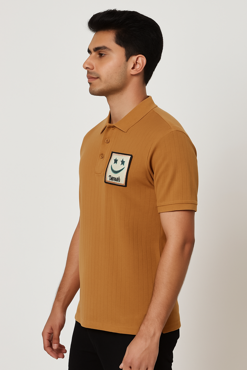 Men’s Camel Brown Ribbed Polo T-Shirt with Smile Patch