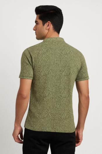 Men’s Olive Green Textured Mandarin Collar T-Shirt – Smart Casual Cotton Blend