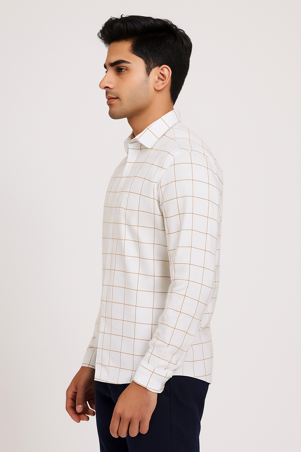 ₹599.00Original price was: ₹599.00.₹499.00Current price is: ₹499.00.Select optionsA stylish white short-sleeve shirt with subtle beige windowpane checks, crafted from breathable cotton for a polished yet casual look.