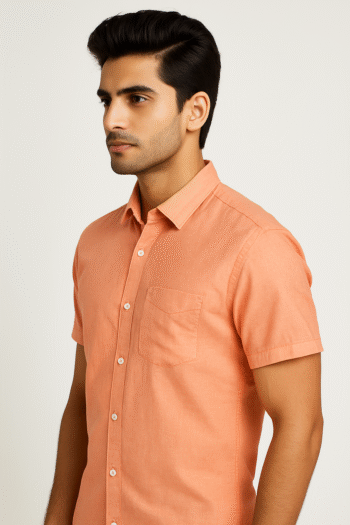 Peach-colored short sleeve button-up shirt with chest pocket, ideal for casual and semi-formal wear.