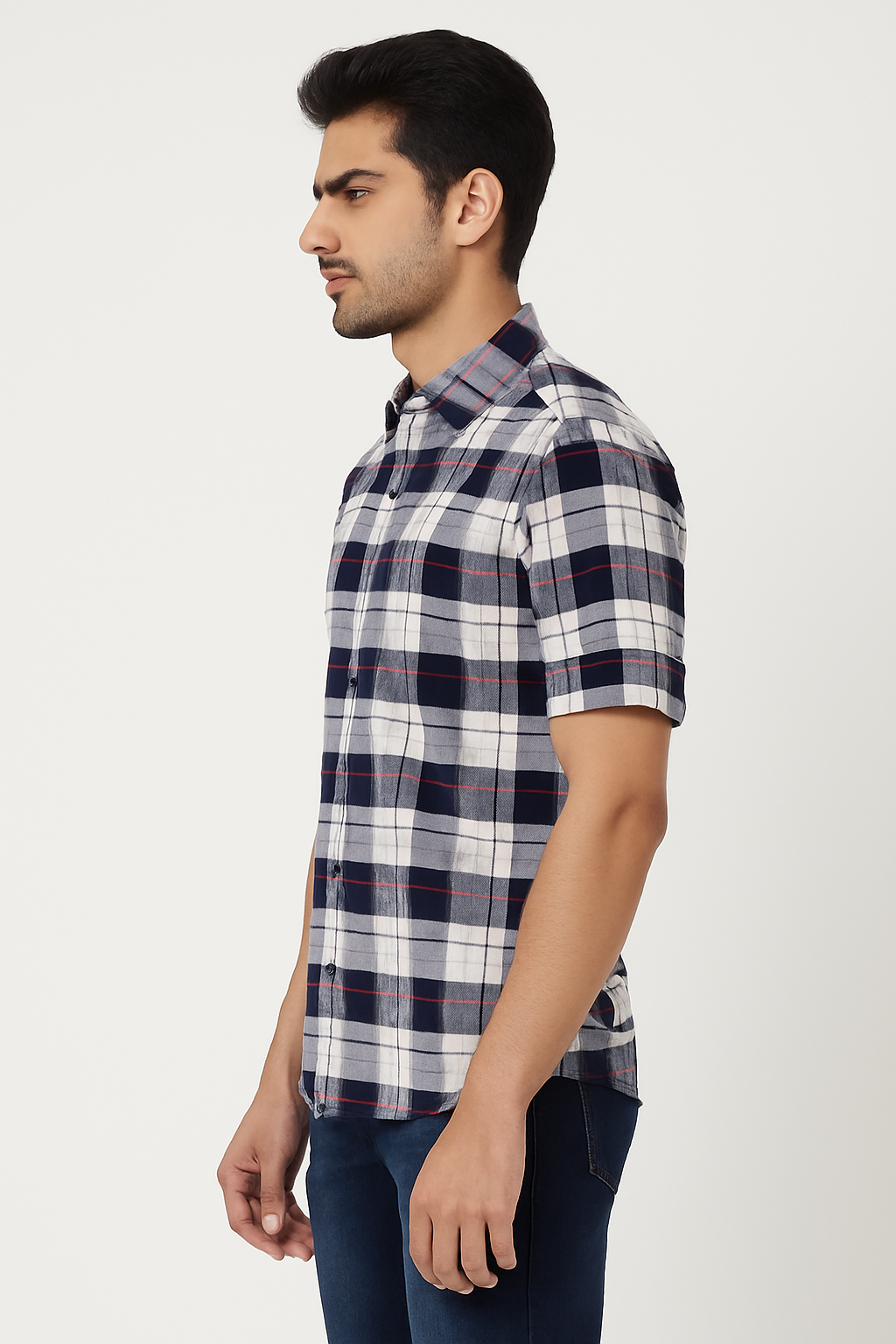 ₹599.00Original price was: ₹599.00.₹499.00Current price is: ₹499.00.Select optionsA stylish navy blue short-sleeve shirt featuring bold red and grey checks. Made from breathable cotton for a smart yet comfortable look.