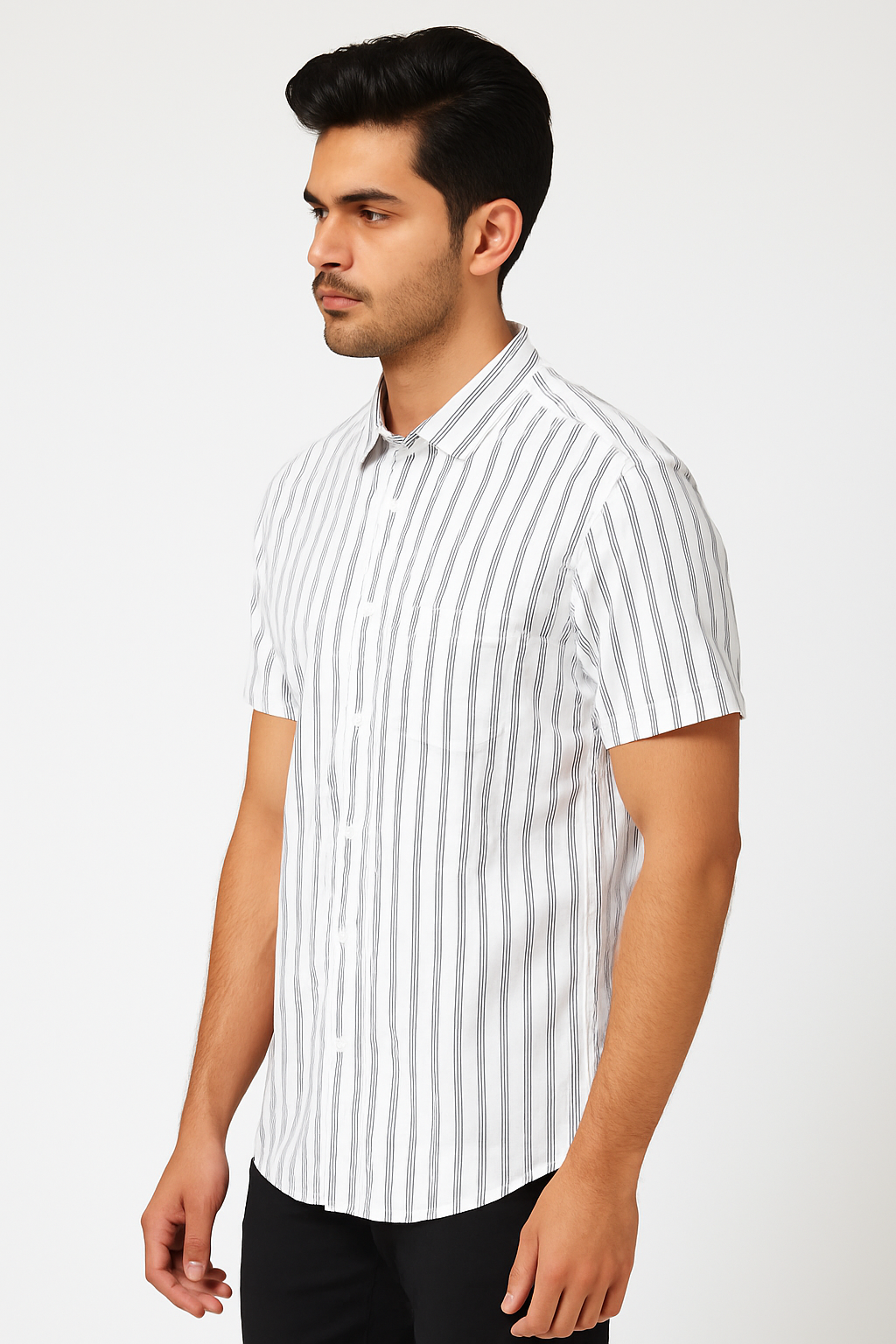 ₹599.00Original price was: ₹599.00.₹499.00Current price is: ₹499.00.Select optionsA crisp white short-sleeve shirt with fine navy vertical stripes, featuring a button-up front and chest pocket—perfect for casual and smart-casual wear.