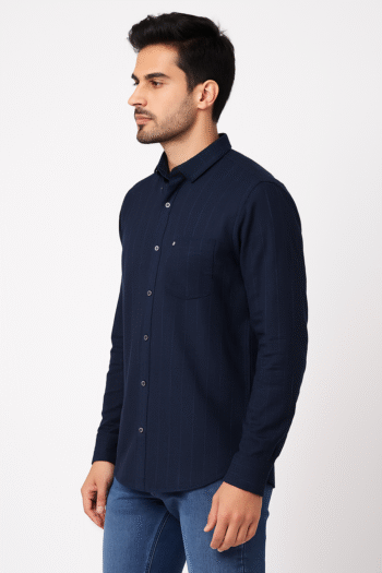 ₹599.00Original price was: ₹599.00.₹499.00Current price is: ₹499.00.Select optionsA navy blue slim-fit shirt with subtle vertical stripes, long sleeves, and a chest pocket — perfect for work or casual wear.