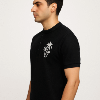 ₹599.00Original price was: ₹599.00.₹499.00Current price is: ₹499.00.Select optionsA sleek black mandarin collar t-shirt featuring a modern button placket and bold palm tree embroidery — combining comfort with contemporary tropical style.