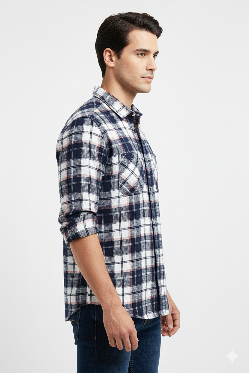 ₹599.00Original price was: ₹599.00.₹499.00Current price is: ₹499.00.Select optionsClassic navy blue and white checkered flannel shirt made from premium cotton for warmth, comfort, and everyday versatility.