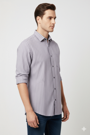 ₹599.00Original price was: ₹599.00.₹499.00Current price is: ₹499.00.Select optionsA light lavender cotton shirt with subtle vertical stripes, button-down front, and roll-up sleeves — blending comfort with a refined casual style.