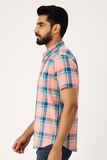 Men’s Peach & Blue Checkered Cotton Casual Short Sleeve Shirt
