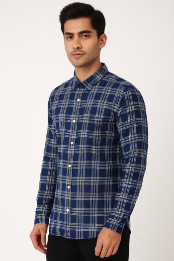 ₹599.00Original price was: ₹599.00.₹499.00Current price is: ₹499.00.Select optionsNavy blue slim fit checked shirt with button-down front and chest logo—perfect for casual and semi-formal occasions.