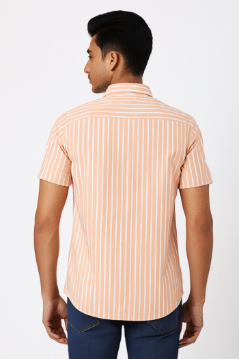 ₹599.00Original price was: ₹599.00.₹499.00Current price is: ₹499.00.Select optionsA refreshing pink shirt with crisp white vertical stripes, tailored in a short sleeve design for modern casual elegance.