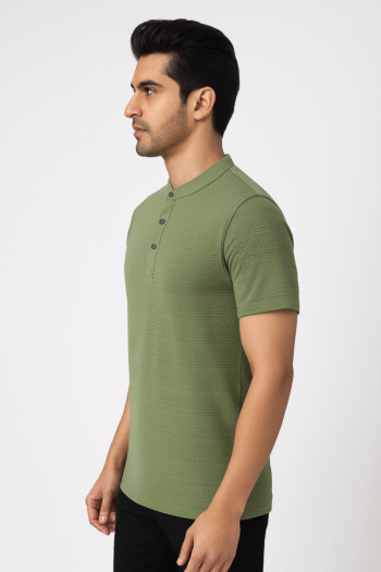 Men’s Olive Green Textured Mandarin Collar T-Shirt – Smart Casual Cotton Blend