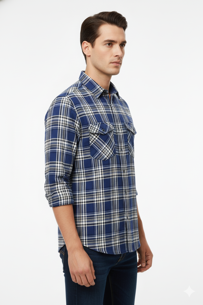 ₹599.00Original price was: ₹599.00.₹499.00Current price is: ₹499.00.Select optionsClassic blue and white checked flannel shirt with dual chest pockets, offering warmth, comfort, and timeless casual style.