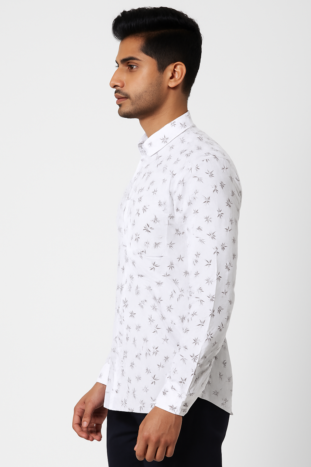 White cotton shirt with leaf print and mandarin collar — lightweight, stylish, and perfect for smart-casual occasions.