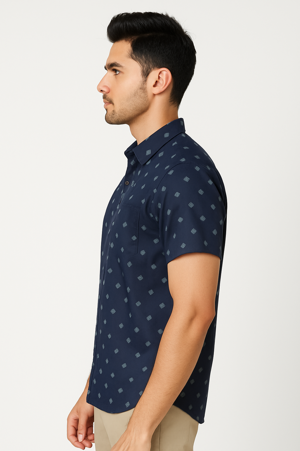 Men’s Navy Blue Micro Diamond Printed Cotton Short Sleeve Shirt