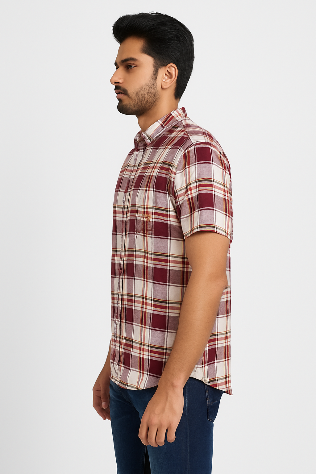 Men’s Maroon & Beige Checked Short Sleeve Shirt