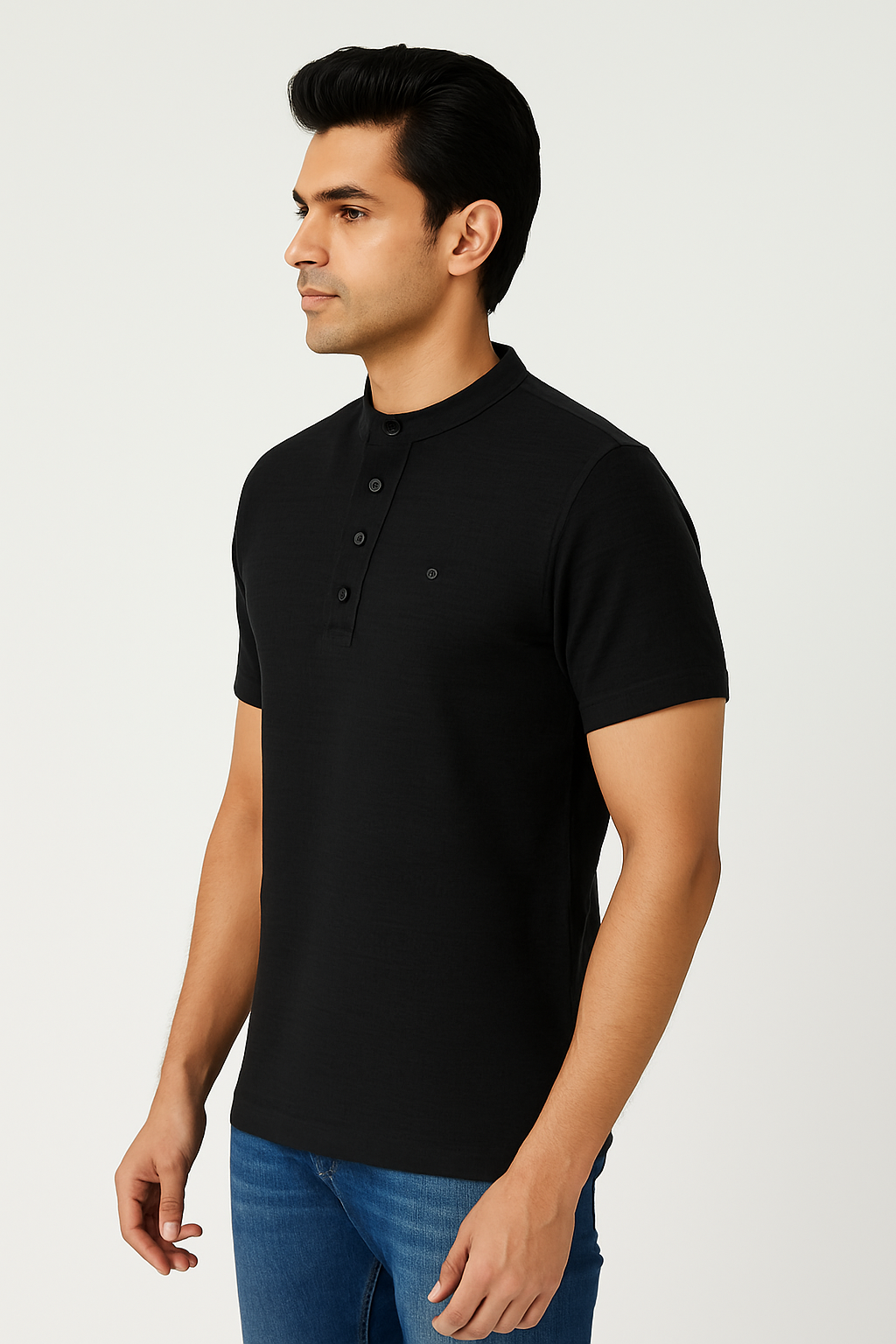 ₹599.00Original price was: ₹599.00.₹499.00Current price is: ₹499.00.Select optionsClassic black Henley t-shirt with a sleek textured finish, mandarin collar, and four-button placket — a perfect blend of comfort and style.