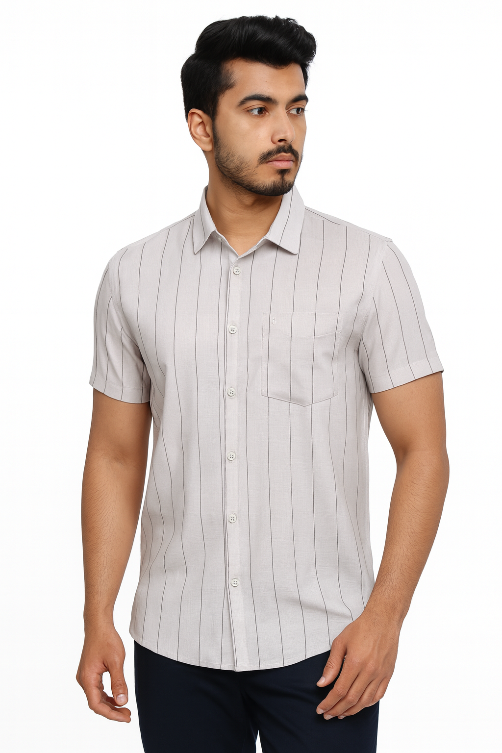 ₹599.00Original price was: ₹599.00.₹499.00Current price is: ₹499.00.Select optionsA sleek light grey short sleeve shirt with fine vertical pinstripes, designed for both casual and semi-formal looks.