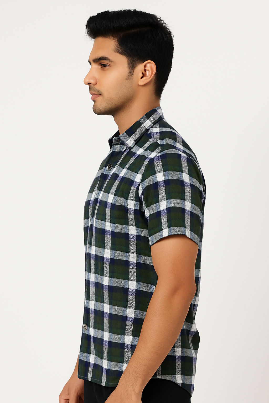 Men’s Green & Navy Checked Cotton Short Sleeve Shirt