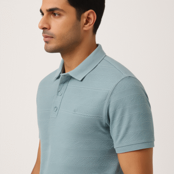₹599.00Original price was: ₹599.00.₹499.00Current price is: ₹499.00.Select optionsCasual yet refined, this sea green polo t-shirt features a soft textured fabric, chest pocket, and a classic buttoned collar — perfect for work or weekends.