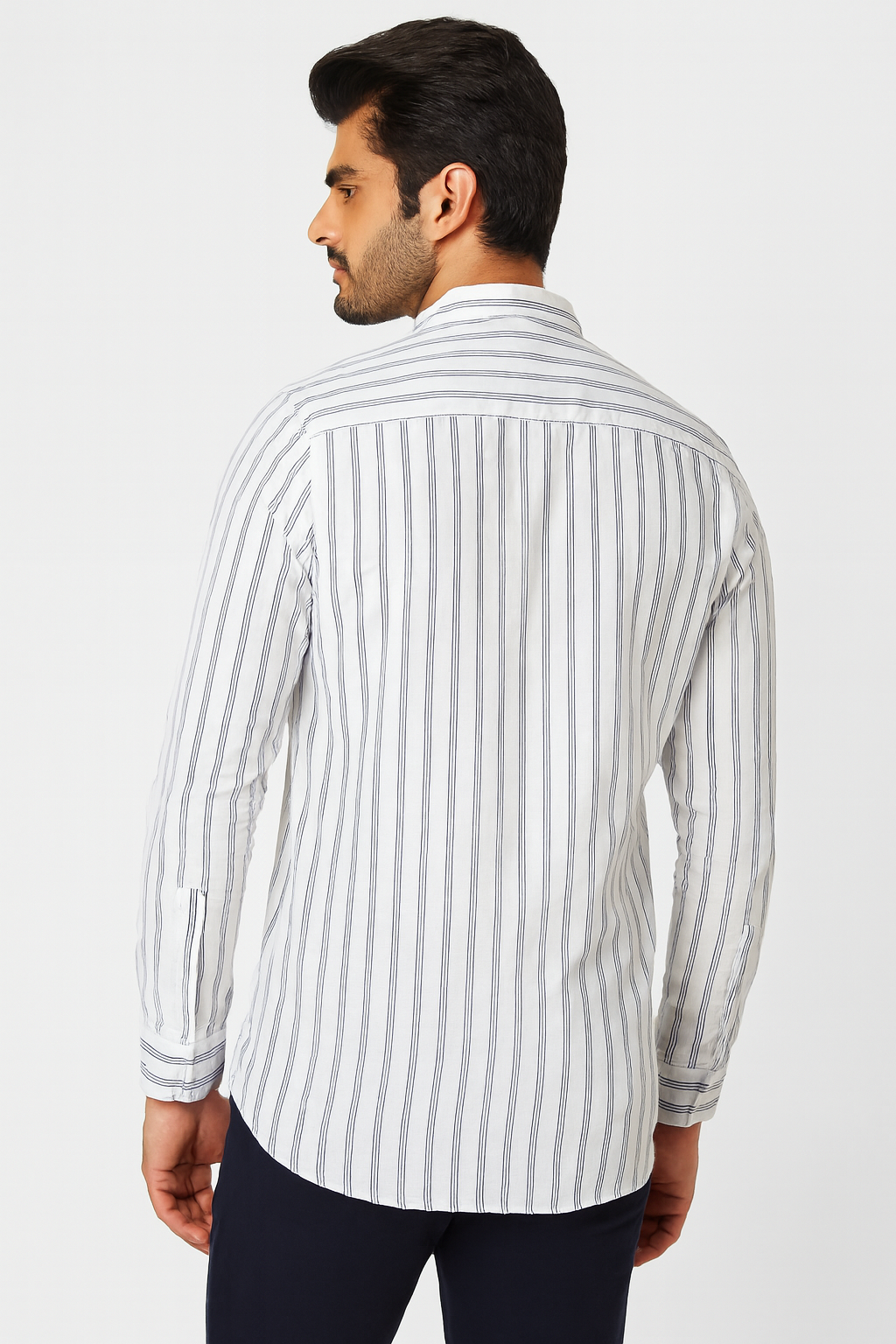 ₹599.00Original price was: ₹599.00.₹499.00Current price is: ₹499.00.Select optionsWhite slim fit shirt with vertical black stripes and chest pocket—ideal for smart casual and semi-formal wear.