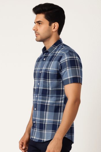 ₹599.00Original price was: ₹599.00.₹499.00Current price is: ₹499.00.Select optionsA modern navy blue checked shirt with a hint of maroon — crafted in soft cotton for all-day comfort and effortless style.