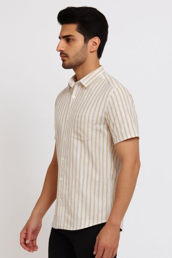 ₹599.00Original price was: ₹599.00.₹499.00Current price is: ₹499.00.Select optionsA stylish beige short-sleeve shirt with subtle brown vertical stripes, made from premium cotton for all-day comfort and effortless sophistication.