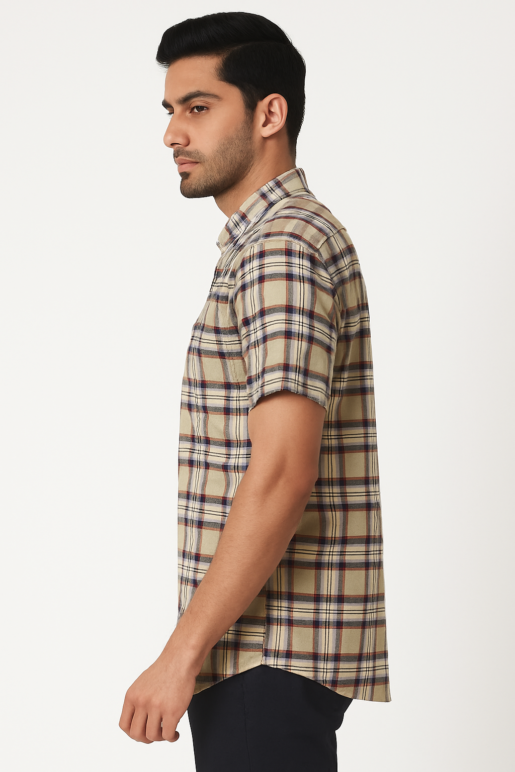 Men’s Beige & Maroon Checkered Casual Short Sleeve Shirt