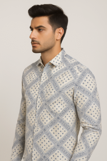 ₹599.00Original price was: ₹599.00.₹499.00Current price is: ₹499.00.Select optionsA unique off-white printed shirt with a geometric diamond pattern — combining tradition-inspired design with contemporary tailoring.