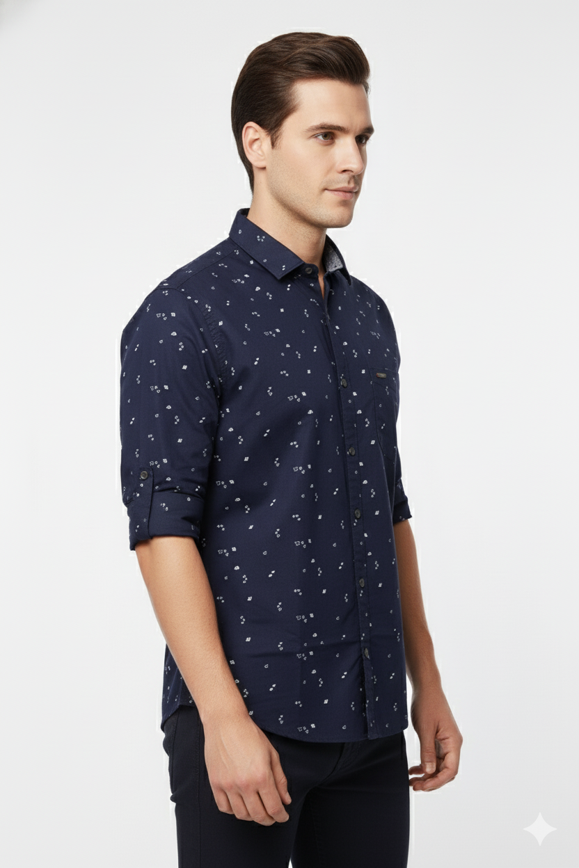 ₹599.00Original price was: ₹599.00.₹499.00Current price is: ₹499.00.Select optionsA stylish navy blue cotton shirt with a subtle all-over print—perfect for a modern, relaxed, and confident look.