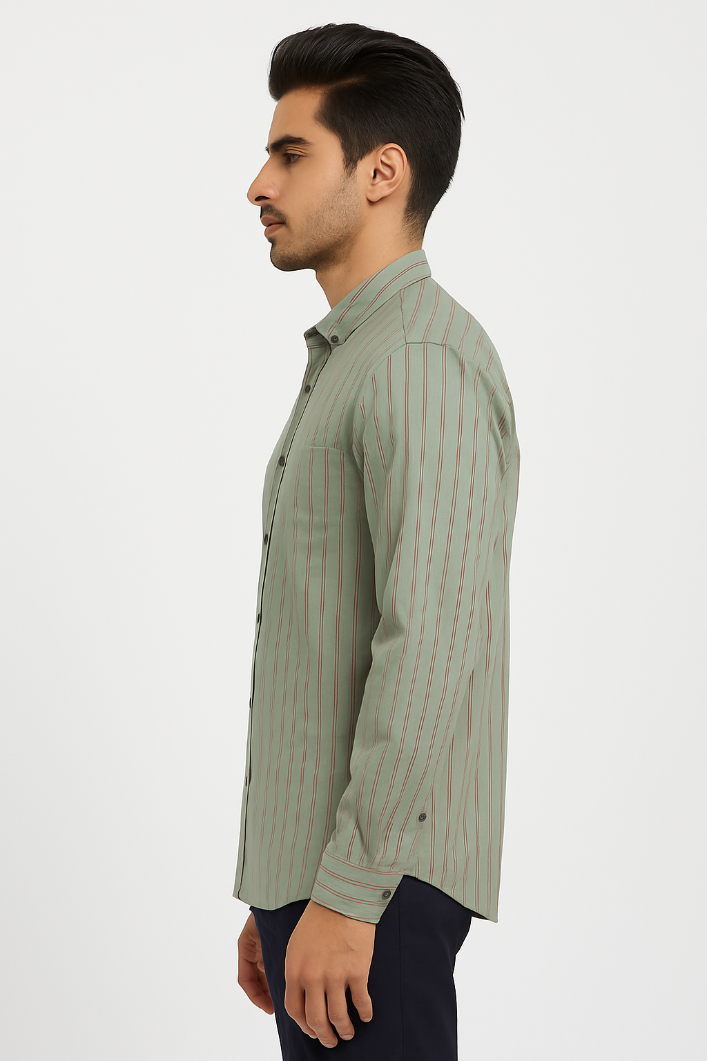 A stylish olive green striped shirt offering timeless elegance with relaxed comfort — perfect for every occasion.