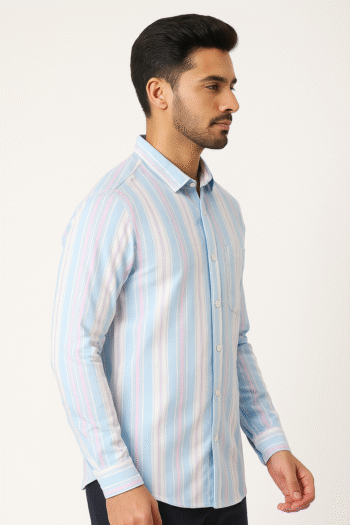 Men’s Pastel Blue Multicolor Striped Casual Slim-Fit Shirt