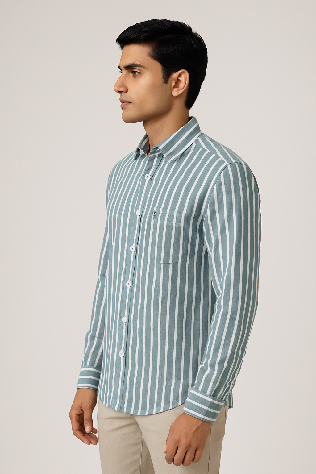 Men’s Sage Green & White Vertical Striped Casual Shirt
