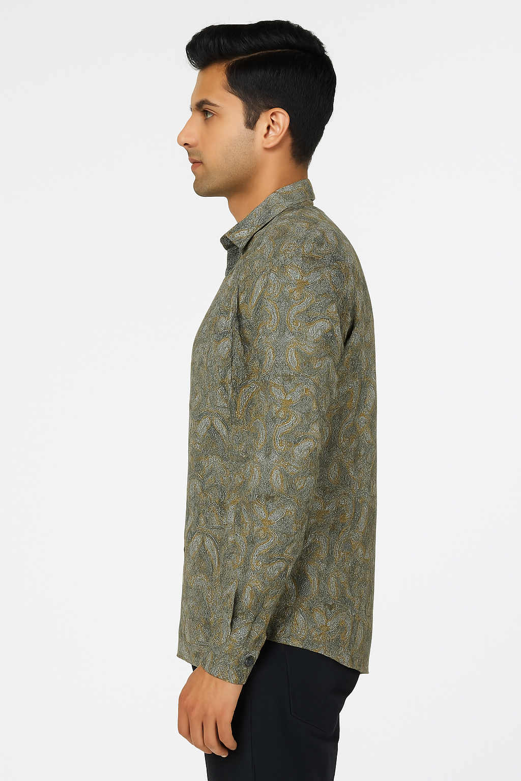 Olive Paisley Print Long-Sleeve Casual Shirt