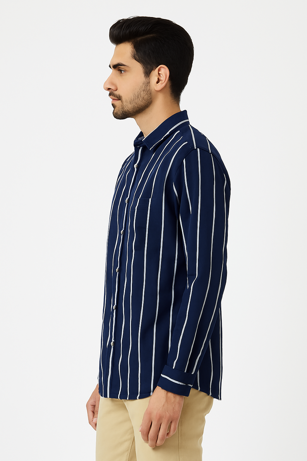 ₹599.00Original price was: ₹599.00.₹499.00Current price is: ₹499.00.Select optionsA trendy navy-blue slim-fit shirt featuring bold vertical white stripes, full sleeves, and a classic button-down front—ideal for casual outings, evening wear, and smart everyday styling.