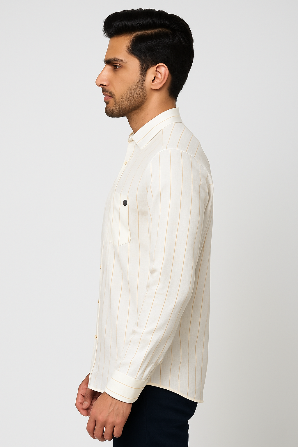 ₹599.00Original price was: ₹599.00.₹499.00Current price is: ₹499.00.Select optionsCream cotton shirt with mustard vertical stripes — elegant, breathable, and perfect for smart-casual style.