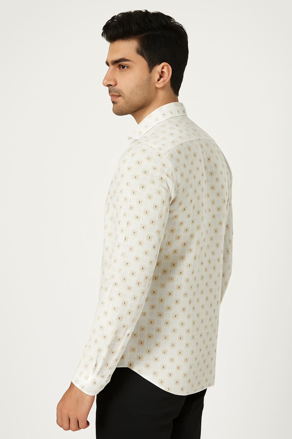 Cream slim-fit cotton shirt with geometric print — stylish, comfortable, and ideal for smart-casual wear.