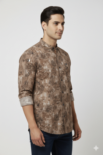 Men’s Brown Printed Mandarin Collar Cotton Shirt