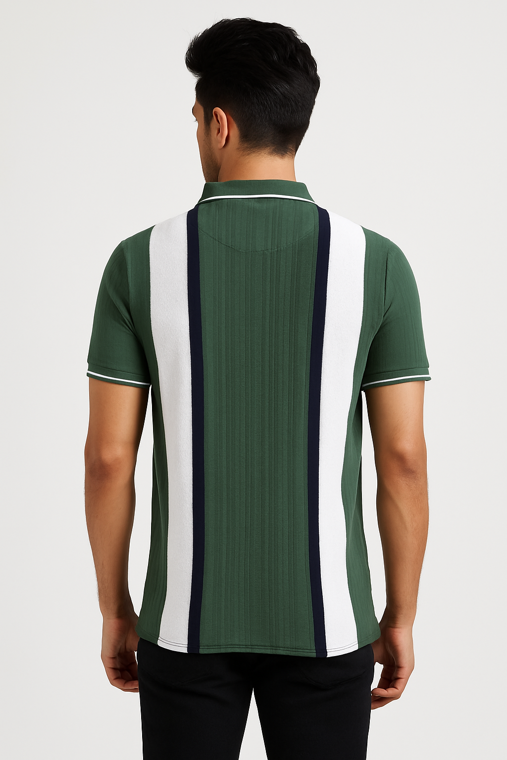 ₹599.00Original price was: ₹599.00.₹499.00Current price is: ₹499.00.Select optionsClassic green polo t-shirt with bold vertical stripes, perfect for a smart casual look