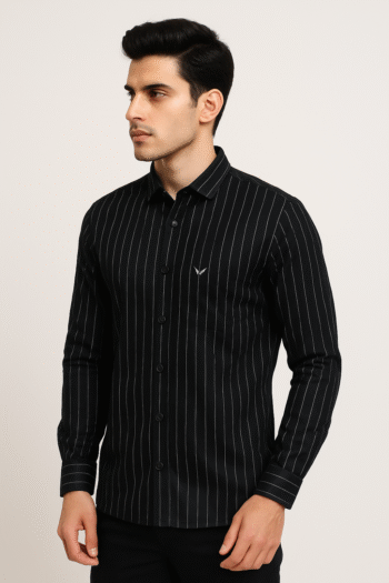 ₹599.00Original price was: ₹599.00.₹499.00Current price is: ₹499.00.Select optionsBlack full sleeve shirt with bold white vertical stripes and chest pocket.