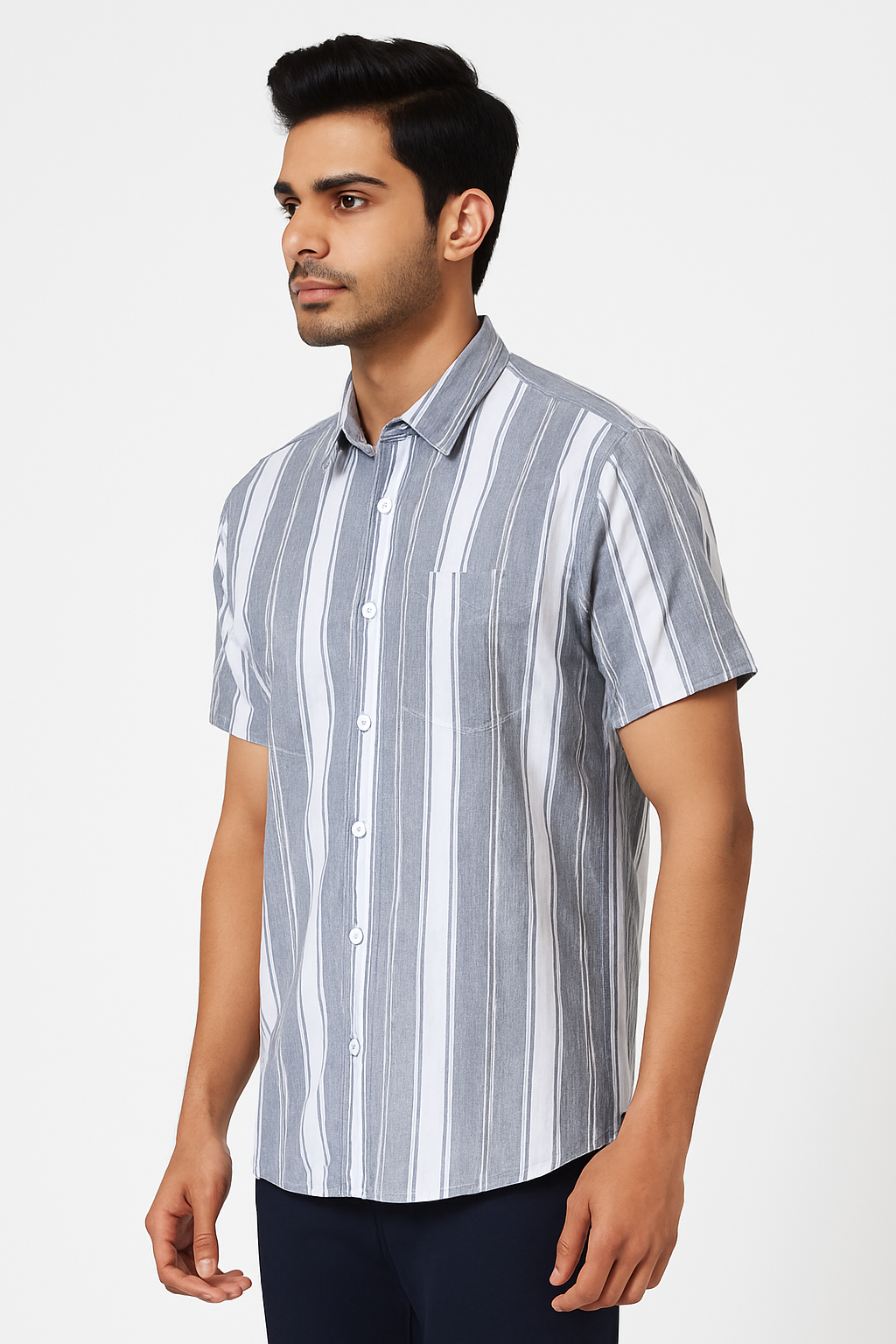 Men’s Grey & White Vertical Striped Cotton Short Sleeve Shirt