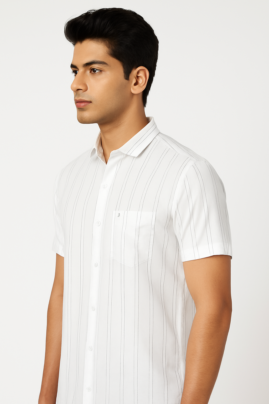 ₹599.00Original price was: ₹599.00.₹499.00Current price is: ₹499.00.Select optionsA sleek white short-sleeve shirt with fine vertical stripes. Crafted from soft cotton for a modern, polished casual look.