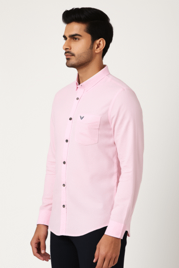 Light pink slim fit men’s shirt with full sleeves, button-down front, and chest pocket – perfect for both casual and formal wear.