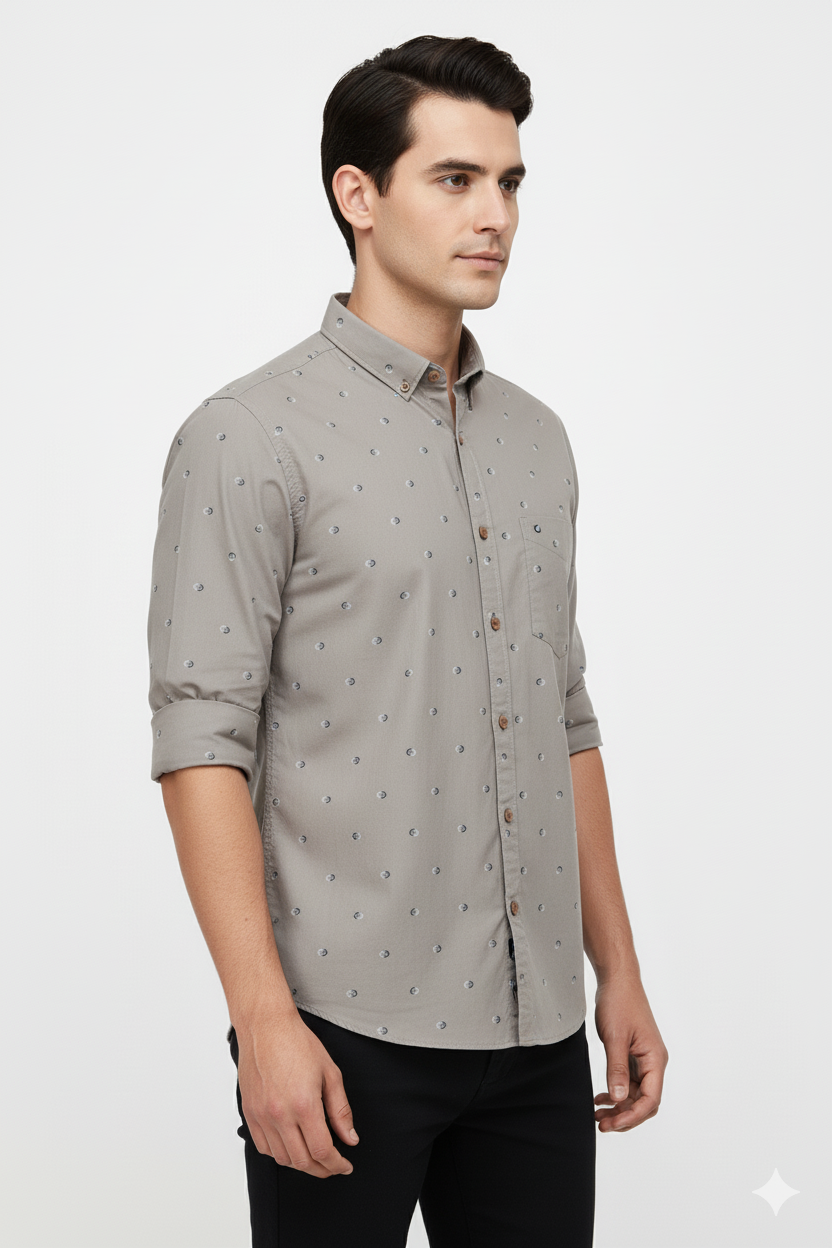 ₹599.00Original price was: ₹599.00.₹499.00Current price is: ₹499.00.Select optionsA stylish grey shirt featuring a subtle all-over micro print, button-down collar, and slim-fit design—perfect for smart-casual outings and everyday wear.