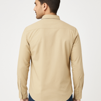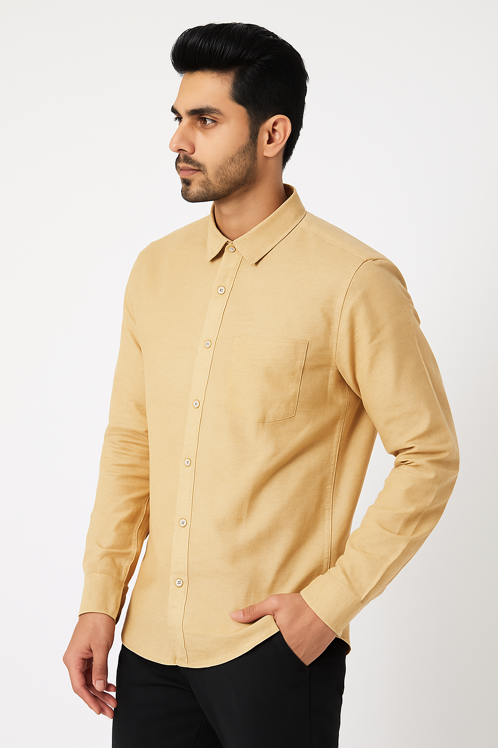 Beige slim fit men’s shirt with full sleeves, button-down style, and chest pocket – ideal for work or casual wear.