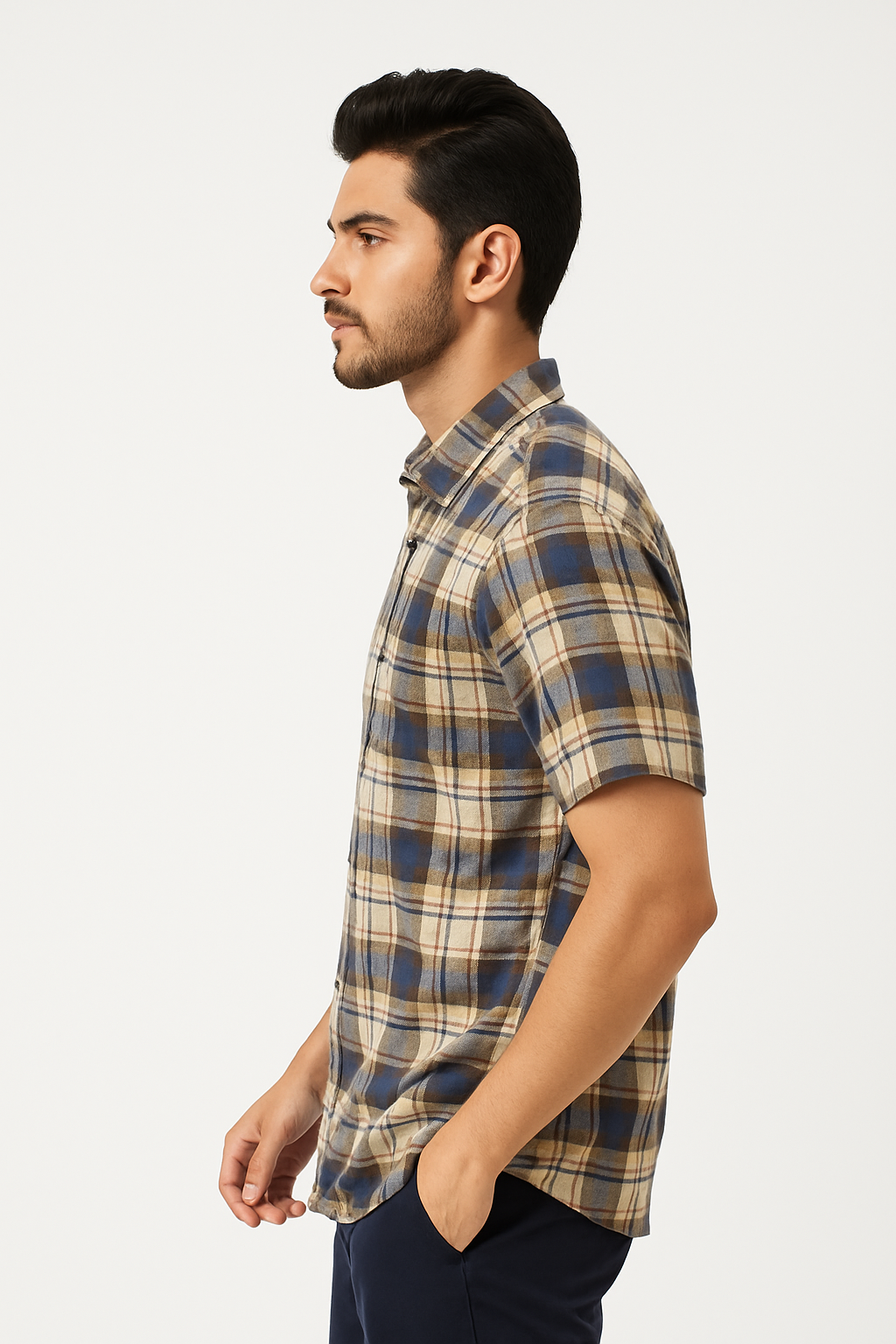 Men’s Navy Blue & Beige Checked Short Sleeve Shirt