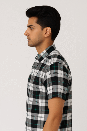 ₹599.00Original price was: ₹599.00.₹499.00Current price is: ₹499.00.Select optionsA classic white short-sleeve shirt with bold black and green checkered patterns, button-up closure, and chest pocket—perfect for casual and smart-casual occasions.