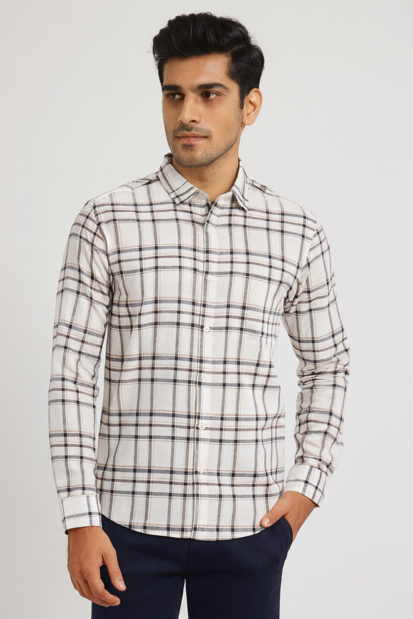 This beige cotton shirt with brown and black checks is a perfect blend of comfort and timeless style. Designed with full sleeves, button-down front, and a smart fit, it is versatile enough to be worn for office meetings, casual outings, or weekend gatherings. Its soft cotton fabric ensures breathable comfort, making it an all-season wardrobe essential.